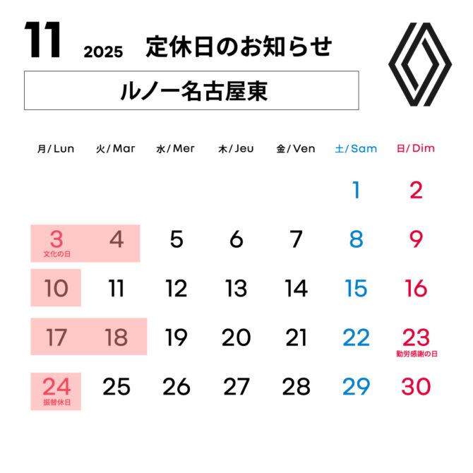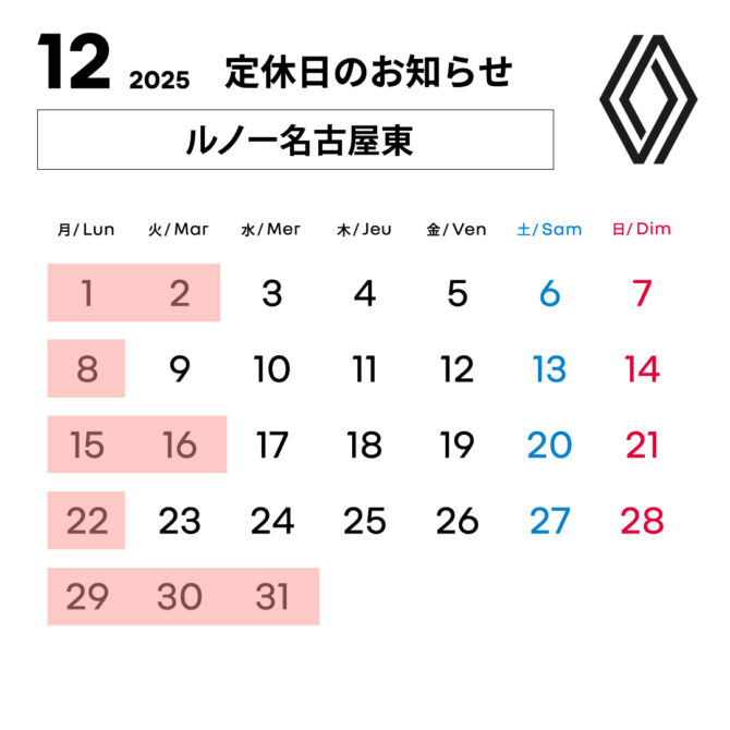 日頃は、ルノー名古屋東をご愛顧いただき誠にありがとうございます。11月・12月の営業日については以下とさせていただきます。