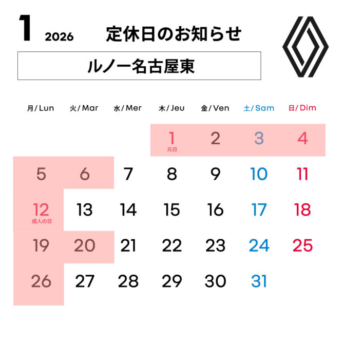 日頃は、ルノー名古屋東をご愛顧いただき誠にありがとうございます。12月・1月の営業日については以下とさせていただきます。