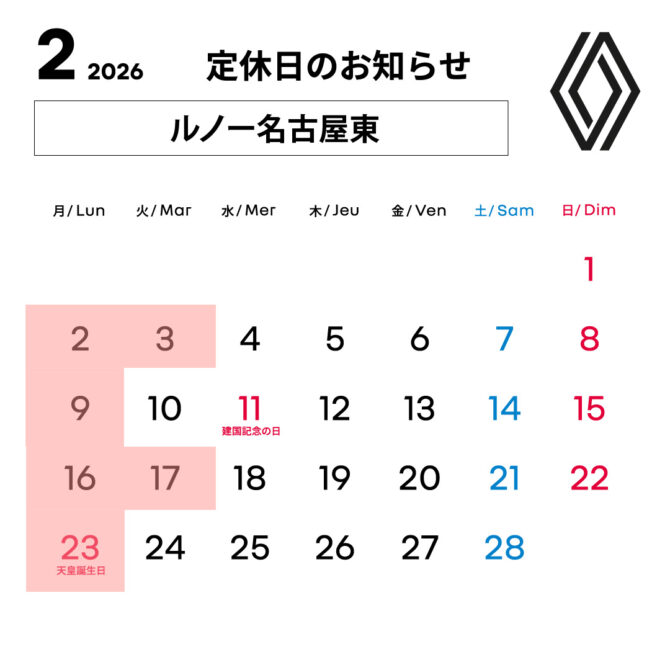 日頃は、ルノー名古屋東をご愛顧いただき誠にありがとうございます。1月・2月の営業日については以下とさせていただきます。