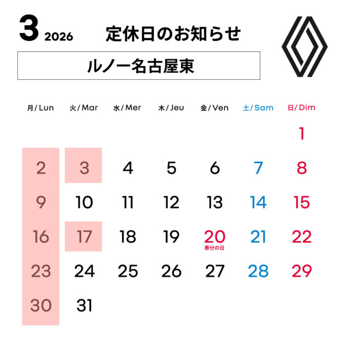 日頃は、ルノー名古屋東をご愛顧いただき誠にありがとうございます。2月・3月の営業日については以下とさせていただきます。